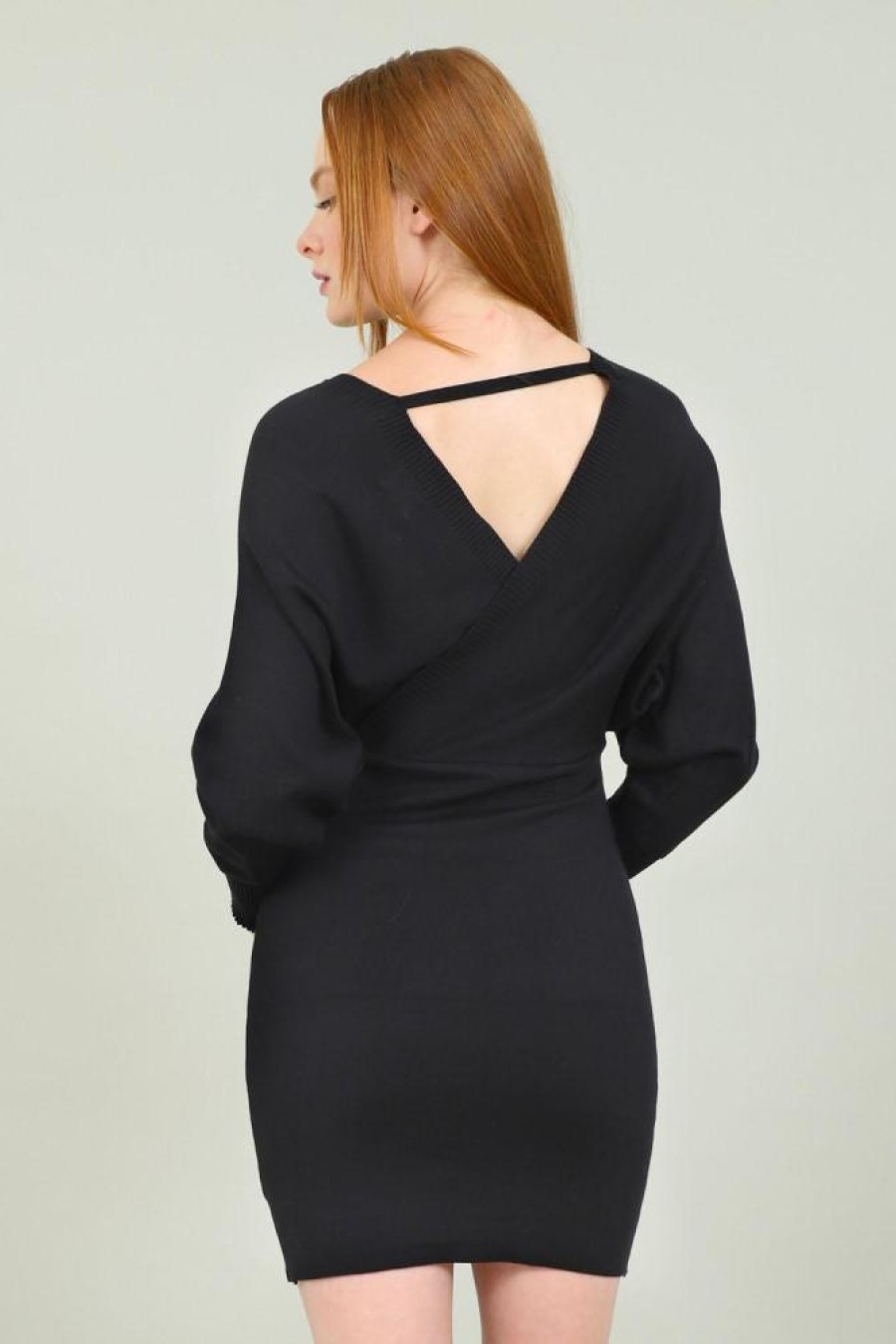 Μίνι φόρεμα πλεκτό κρουαζέ σε μαύρο χρώμα. Κατασκευασμένο από 100% βισκόζη. Το μοντέλο έχει ύψος 1,80μ και φοράει μέγεθος small, με περίμετρο στήθους 85εκ, περίμετρο μέσης 63εκ και περίμετρο γοφών 88εκ.