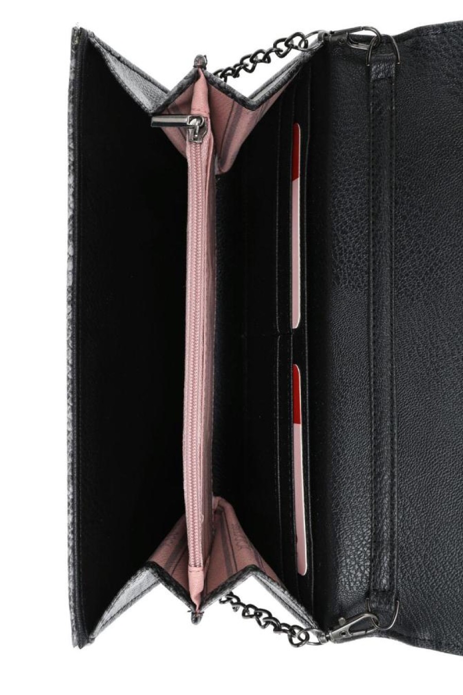 Γυναικείο βραδινό τσαντάκι clutch σε γκρι χρώμα με animal print, υφή φίδι, κλείσιμο με καπάκι και αλυσίδα. Κατασκευασμένο από συνθετικό δέρμα.